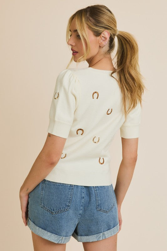 Western Puff Sleeve Embroidered Knit Top