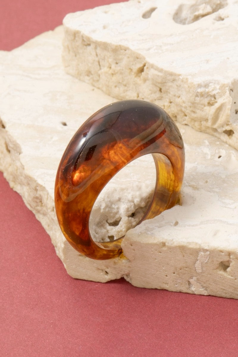 This ring displays a vibrant amber acrlyic dome band style. Experience the joy of accessorizing with this piece that effortlessly combines versatility and charm.