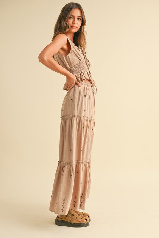 Embroidery Smocking Waist V-neck Top