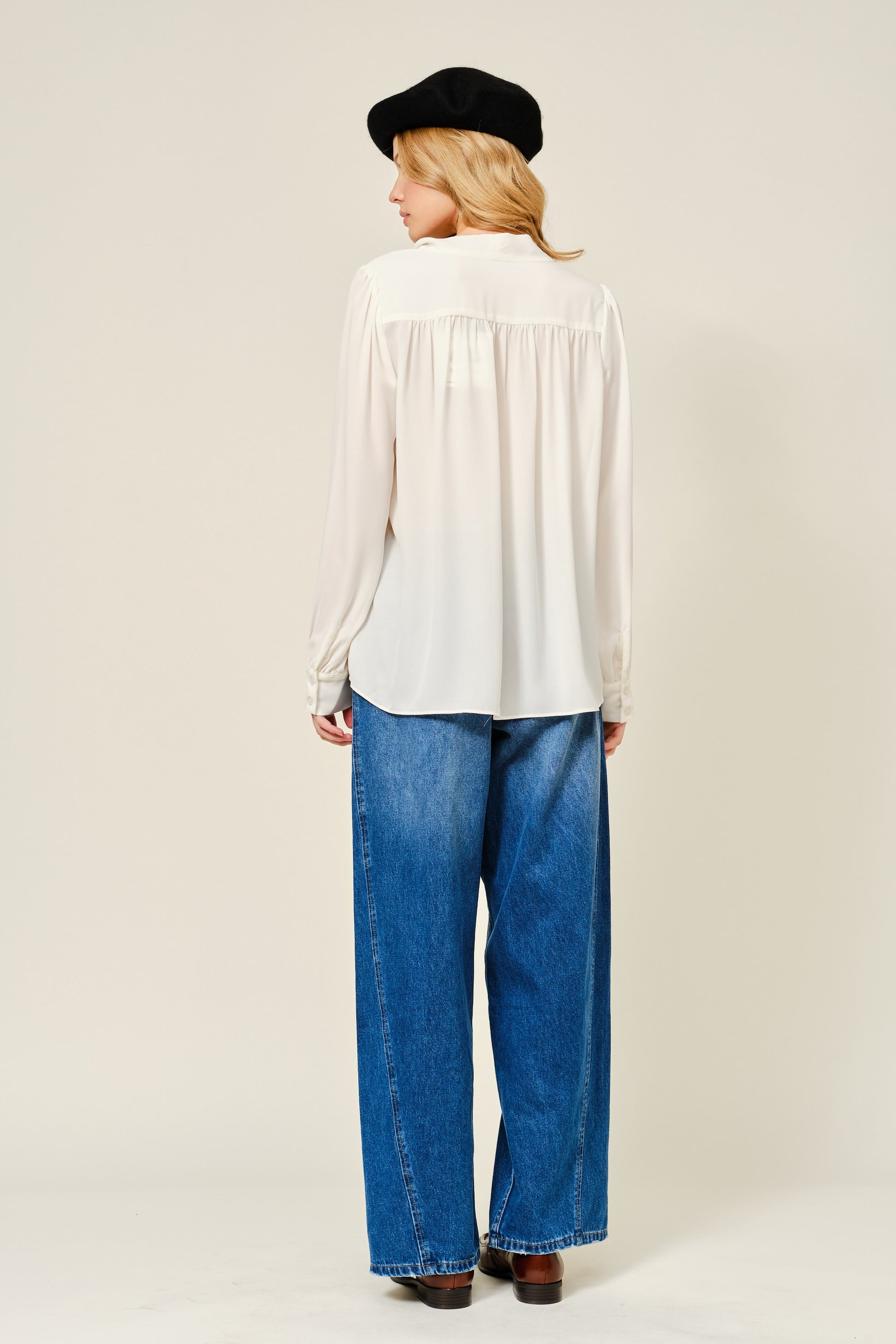A feminine button-up blouse designed with delicate ribbon tie details and subtle shirring for an airy, romantic look. Crafted from lightweight, semi-sheer polyester, it features a soft V-neckline and relaxed fit, perfect for both casual and dressy occasions.