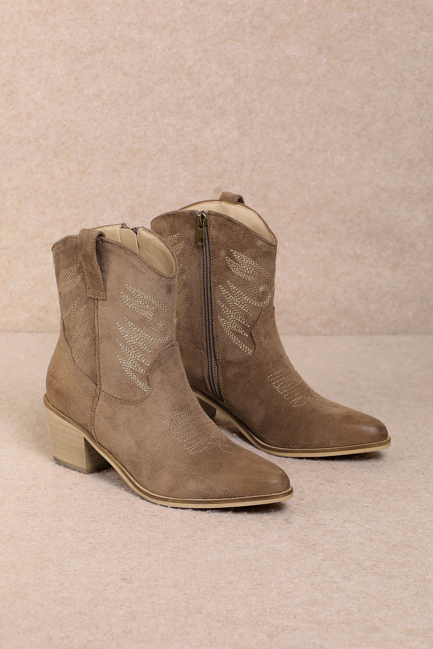 Elevate your wardrobe with the Casey Western Luxe Kinsey Booties. Crafted from premium vegan leather, these white booties exude an expensive feel with exceptional durability. Adorned with delicate stitch embroidery for a luxurious touch, these boots pair perfectly with skirts or dresses. Give your jeans a rest and step into style this season. Perfect for adding a dash of Western glam to any ensemble.