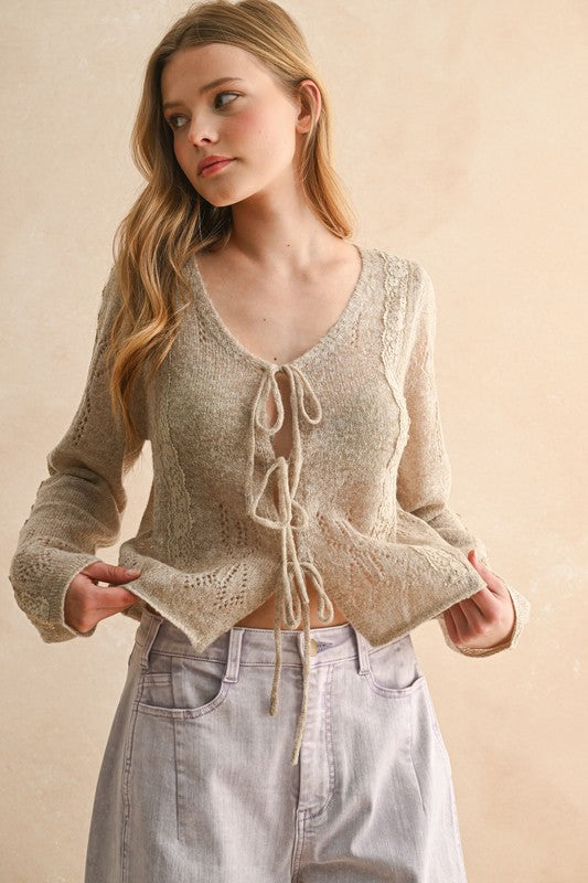 Wrap yourself in cozy charm with this Lace Contrasted Tie Front Knitted Cardigan. Soft knit fabric pairs perfectly with delicate lace details for a playful touch. The tie-front lets you adjust your look, adding a flirty twist to any outfit. Perfect for layering on cool days with a dash of feminine fun!
