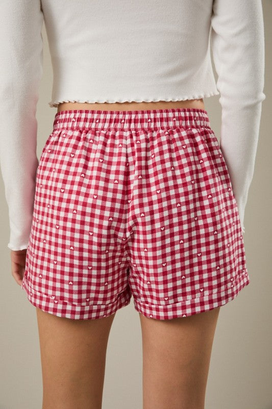 Adorable gingham boxers that bring a touch of sweetness to your everyday essentials. Featuring a charming heart-and-check pattern in soft, breathable fabric, these playful shorts offer comfort without compromising on style. Perfect for lounging at home or layering under your favorite outfits. The relaxed fit and gentle elastic waistband ensure all-day ease, while the whimsical design adds a fun, flirty vibe to your drawer. Treat yourself to comfort that makes you smile.