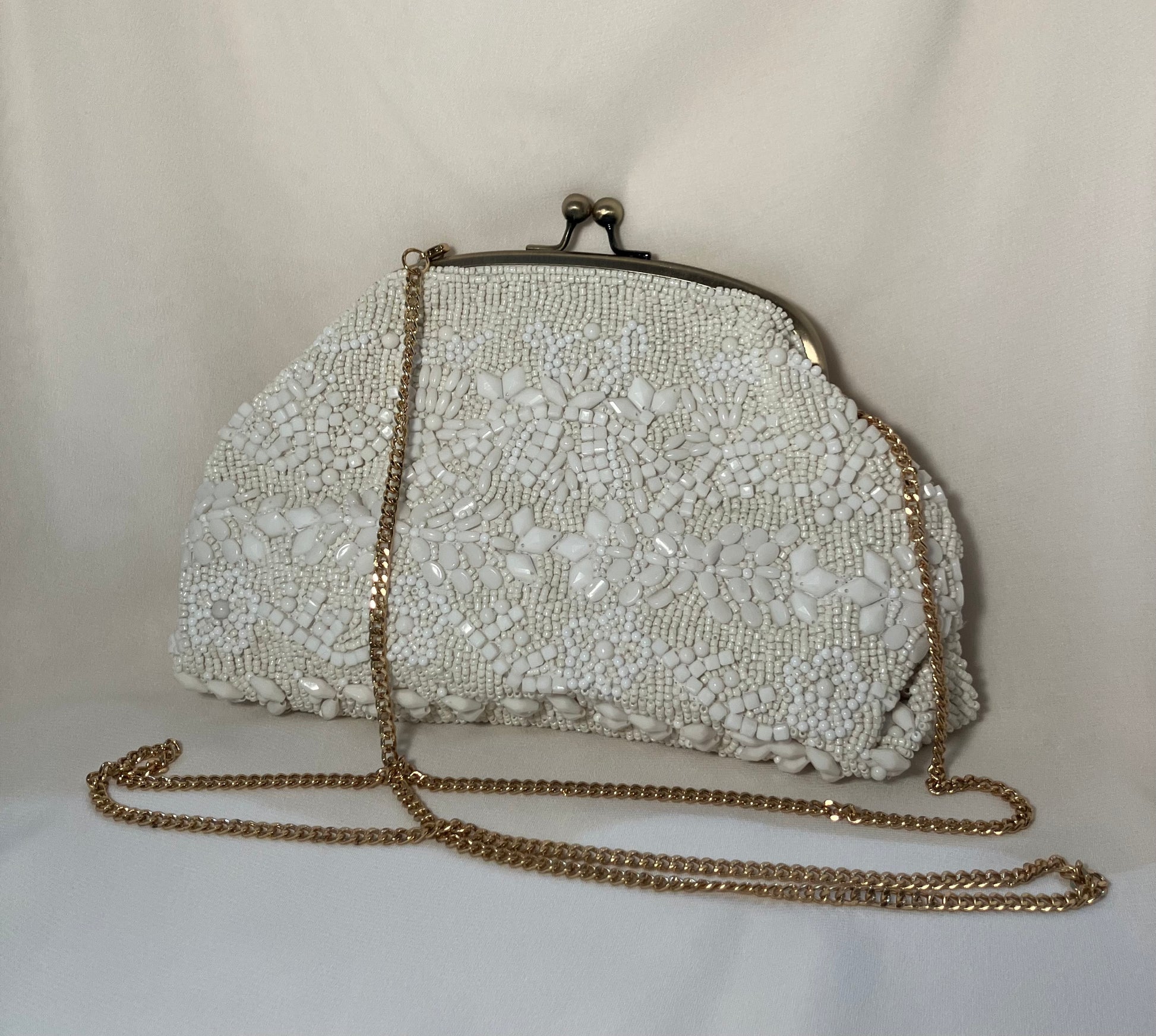 Elevate your ensemble with this White Beaded Clutch Purse, featuring intricate beadwork that adds a refined touch. Its compact design offers just enough space for essentials, making it perfect for elegant evenings and special occasions. The pristine white color complements any outfit, while the beaded detail brings a subtle yet sophisticated shimmer to your look.